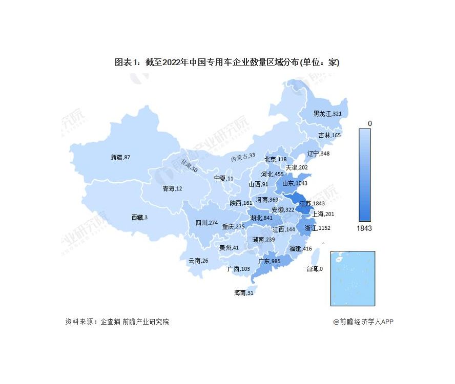 根據(jù)中國企業(yè)數(shù)據(jù)庫企查貓,目前中國專用車企業(yè)主要分布在江蘇、山東、浙江、廣東、湖北等地,其中江蘇企業(yè)數(shù)量最多。截至 2022 年 7 月中旬,江蘇共有相關(guān)專用車企業(yè)數(shù) 1843 家。