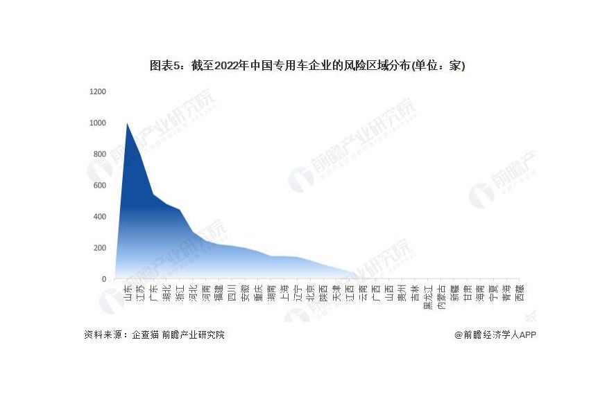 根據(jù)中國企業(yè)數(shù)據(jù)庫企查貓,目前中國專用車有相關(guān)風(fēng)險信息的企業(yè)主要分布在山東省和江蘇省等地。截至目前,江蘇省共有 1001 家企業(yè)涉及風(fēng)險相關(guān)信息,而江蘇則有 799 家企業(yè)涉及風(fēng)險相關(guān)信息。